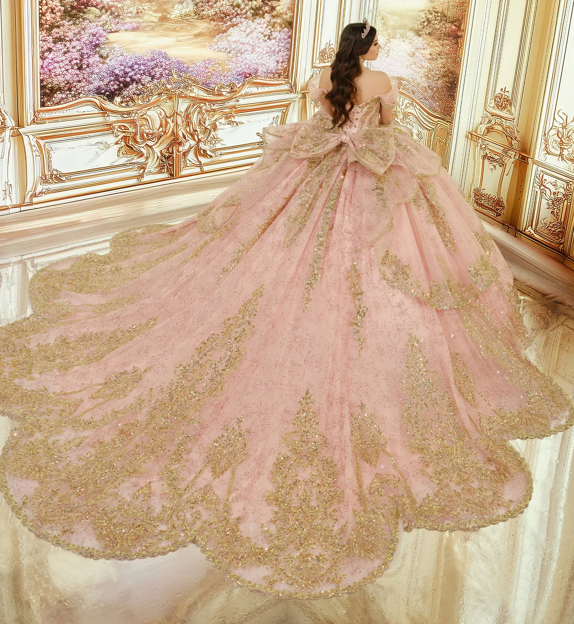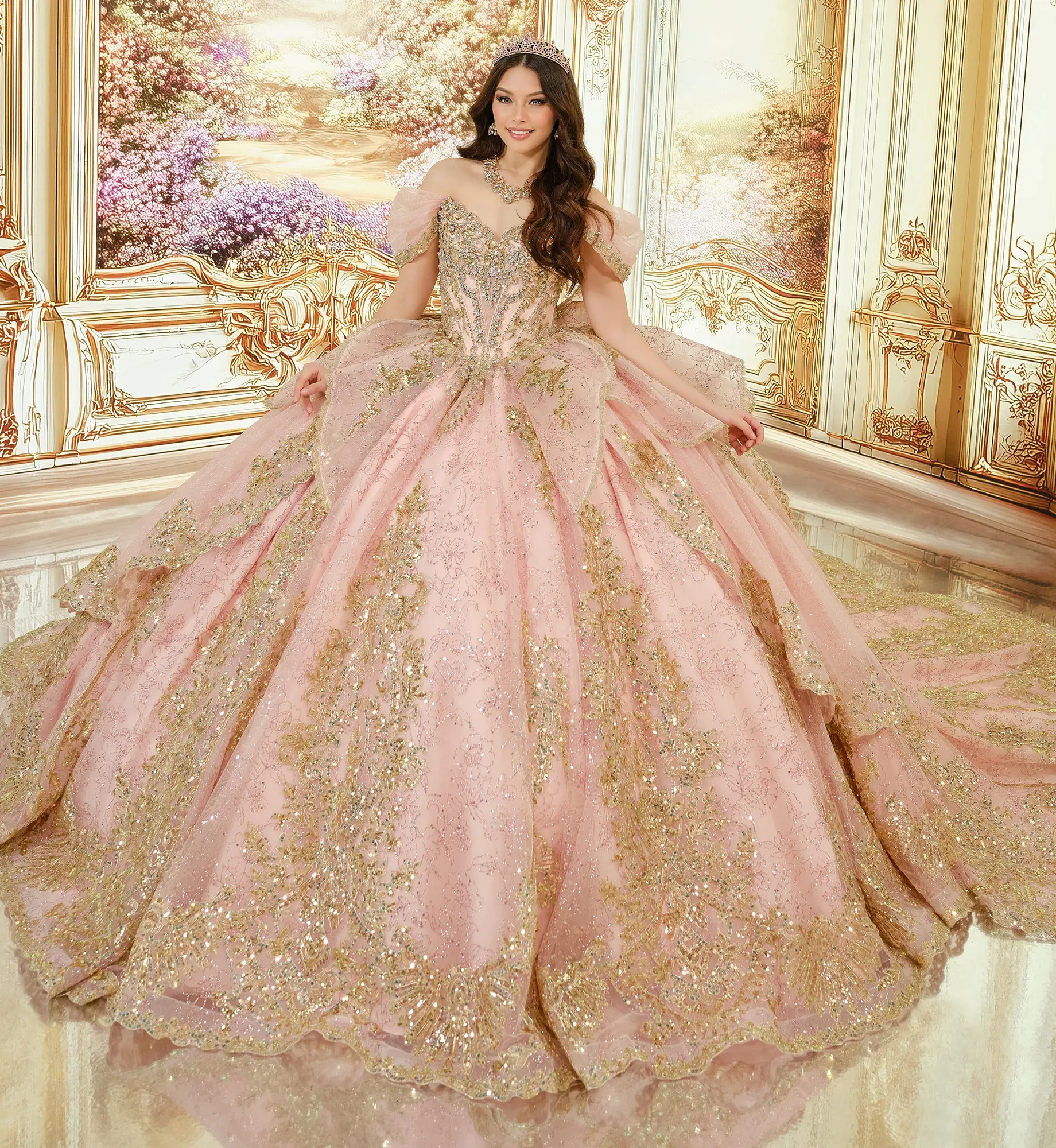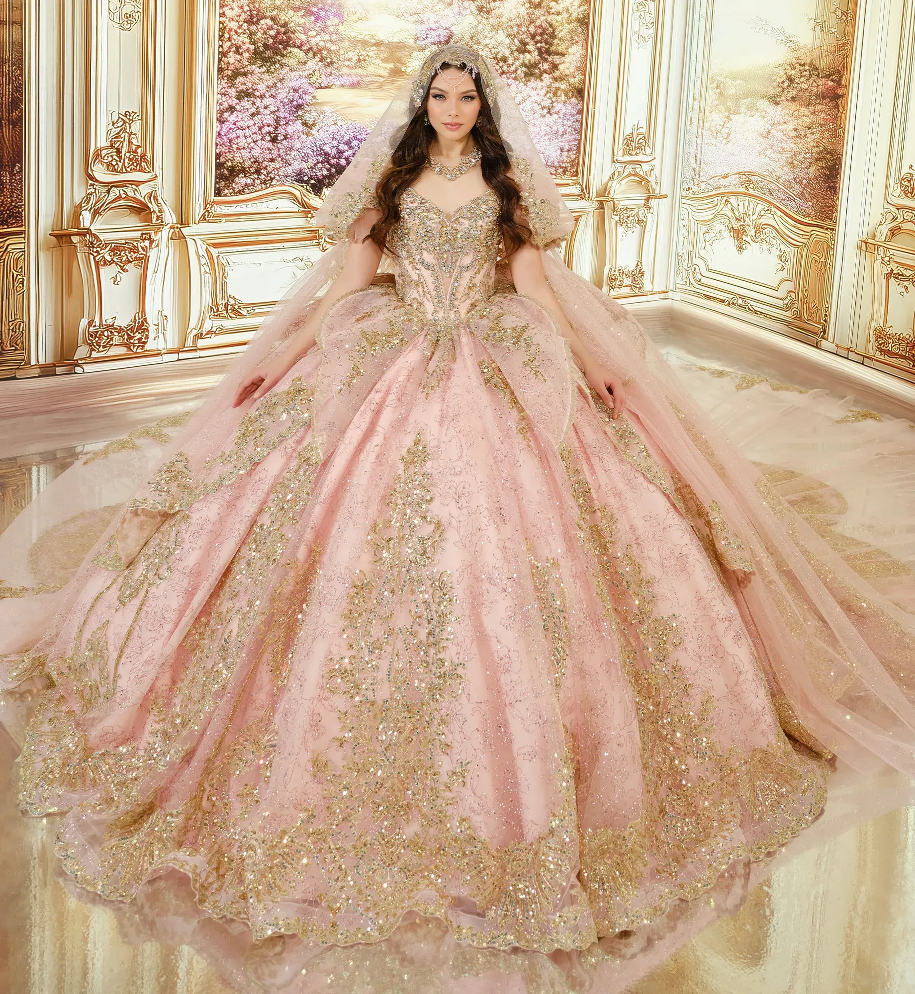 Atemporal y elegante, este vestido de quinceañera con escote corazón cautivará a todos con una cola increíble y un corpiño semitransparente adornado con detalles de hielo agrietado, tul, apliques de encaje metalizado, pedrería, lentejuelas y abalorios. Incluye una capa por separado, tirantes desmontables que dejan los hombros al descubierto, un lazo, una capa pequeña y un panel de modestia para la espalda.