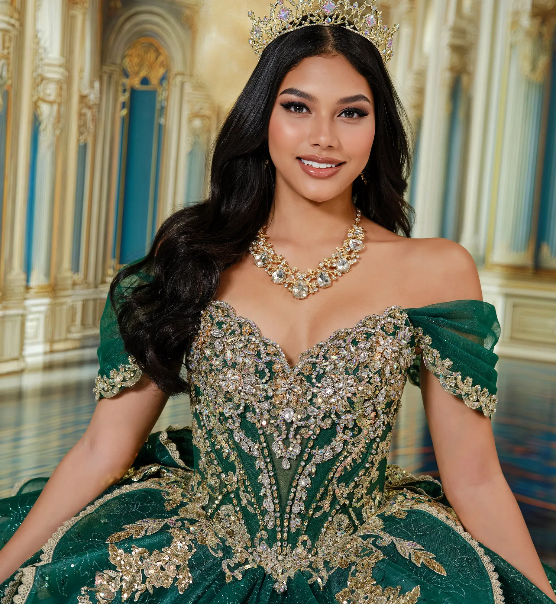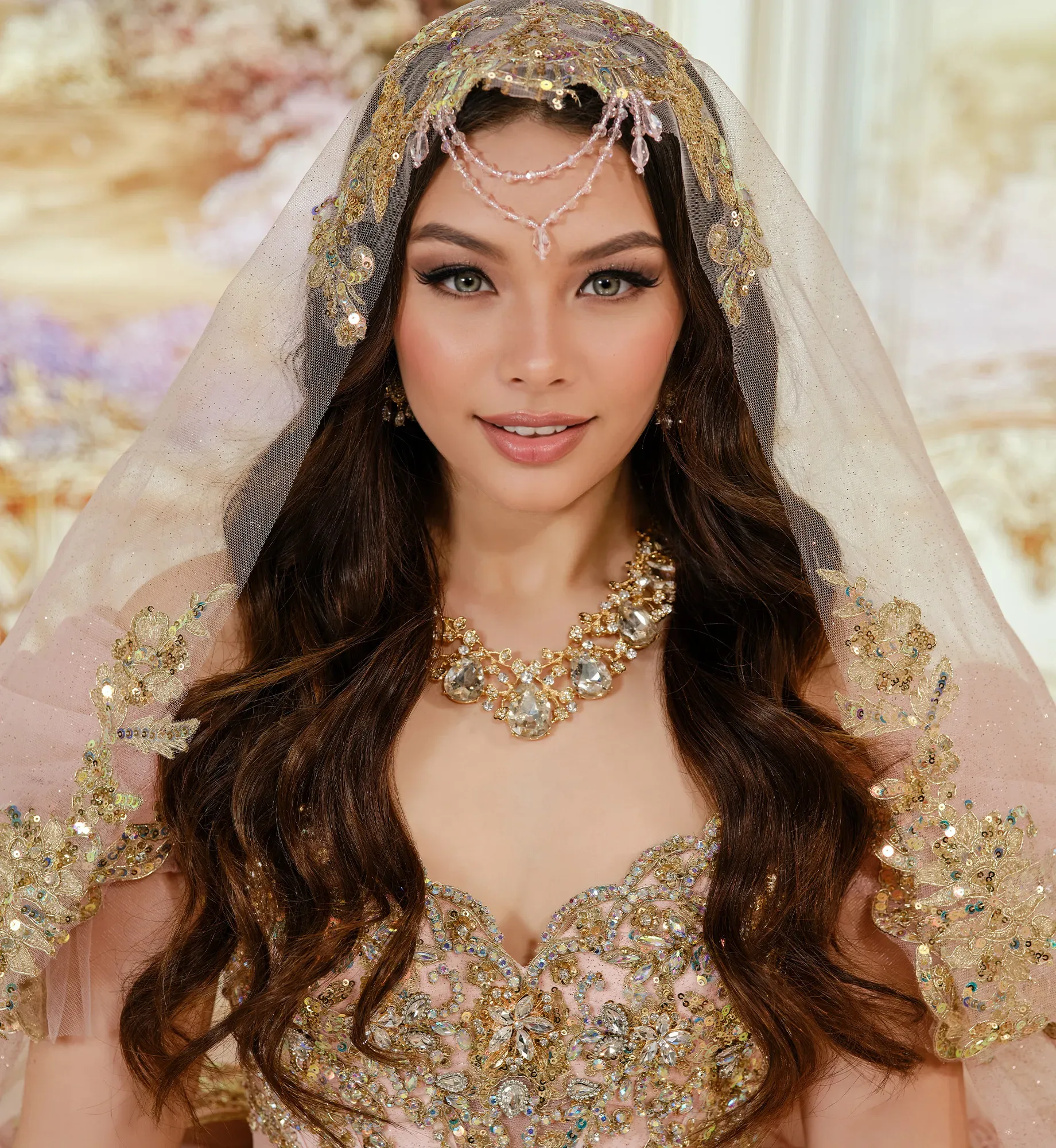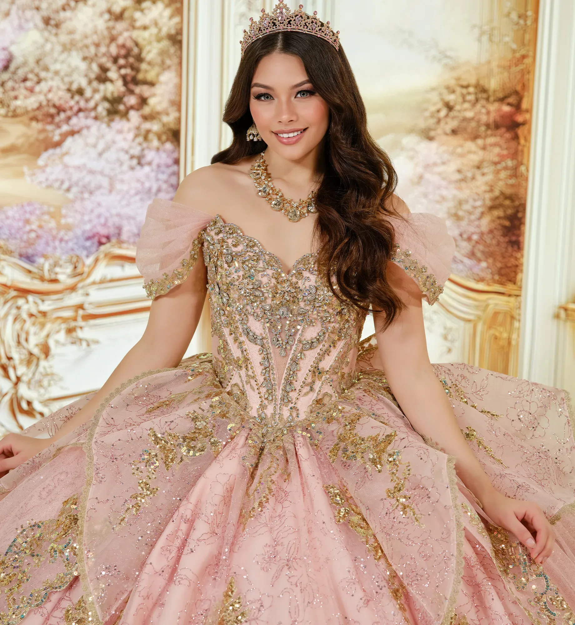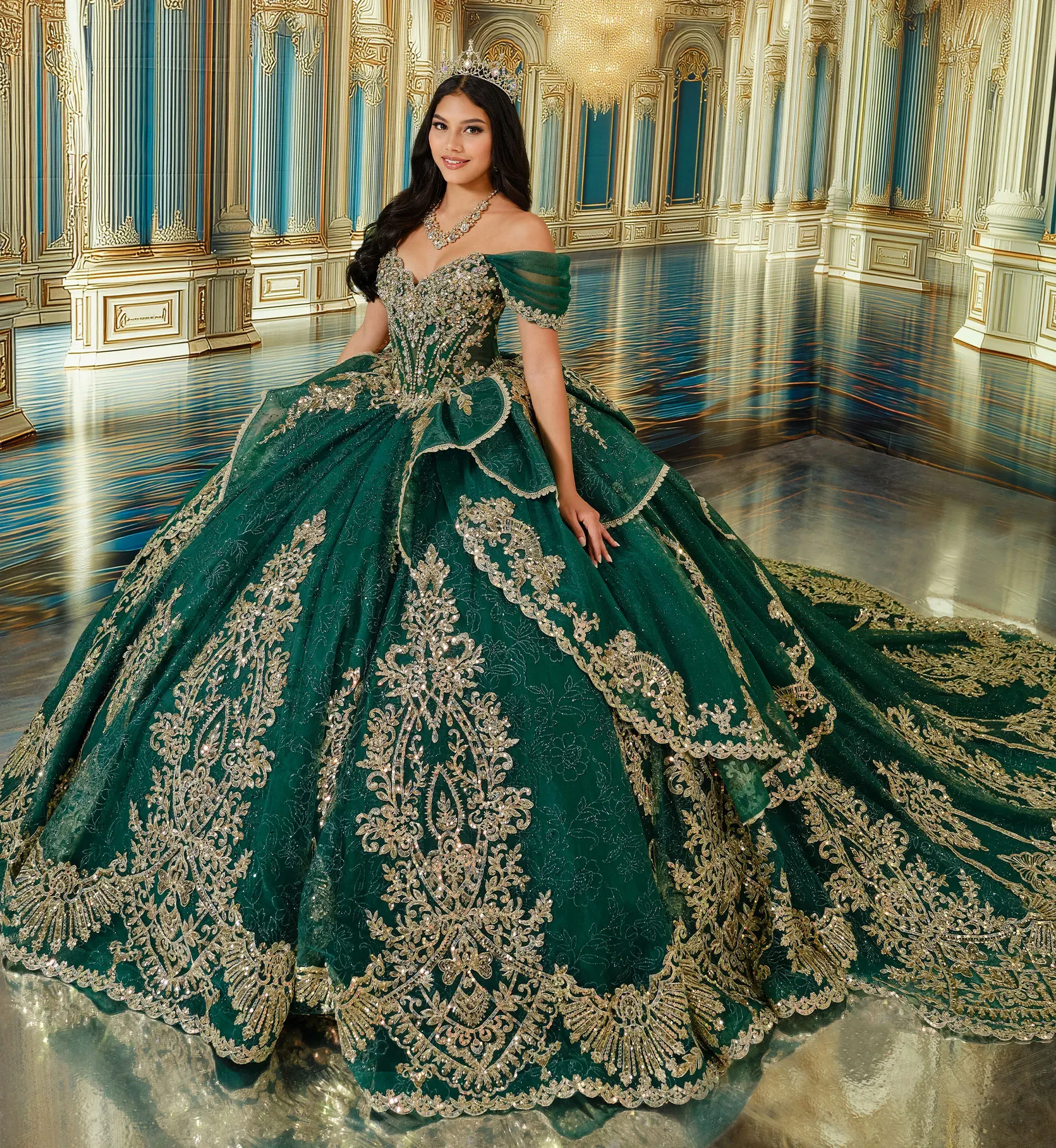Atemporal y elegante, este vestido de quinceañera con escote corazón cautivará a todos con una cola increíble y un corpiño semitransparente adornado con detalles de hielo agrietado, tul, apliques de encaje metalizado, pedrería, lentejuelas y abalorios. Incluye una capa por separado, tirantes desmontables que dejan los hombros al descubierto, un lazo, una capa pequeña y un panel de modestia para la espalda.