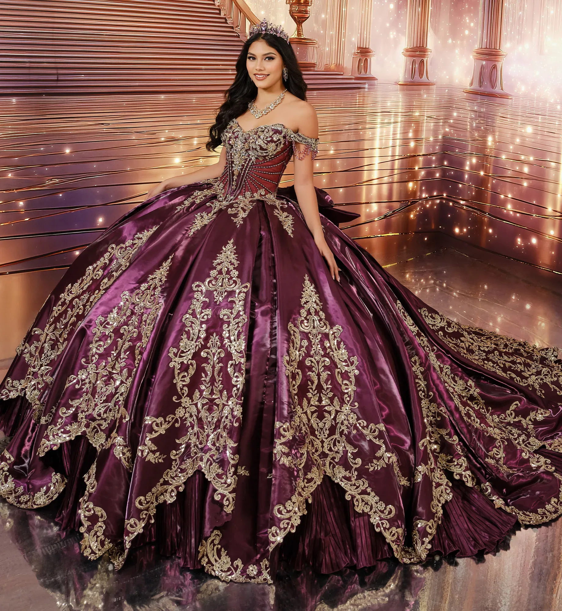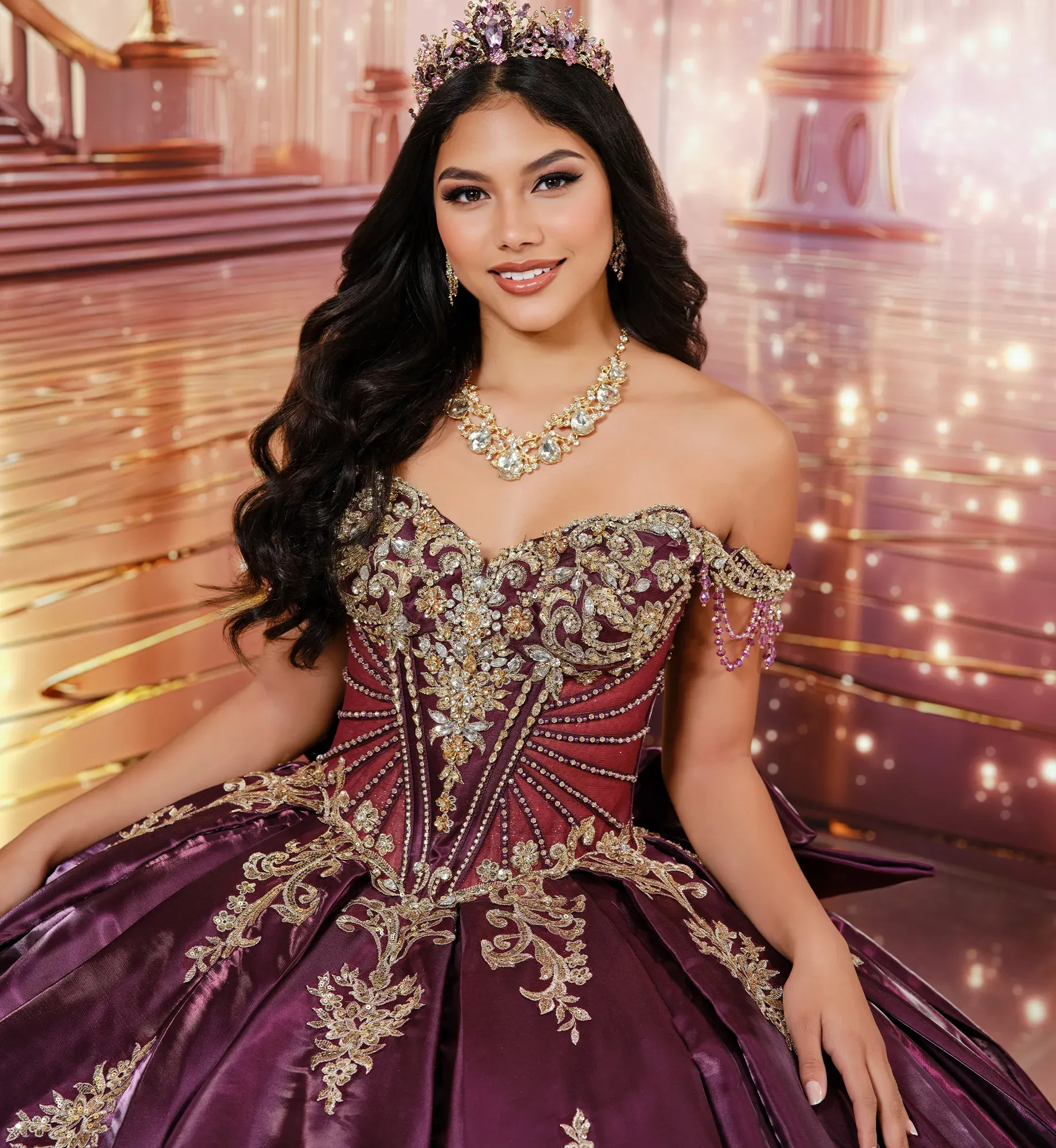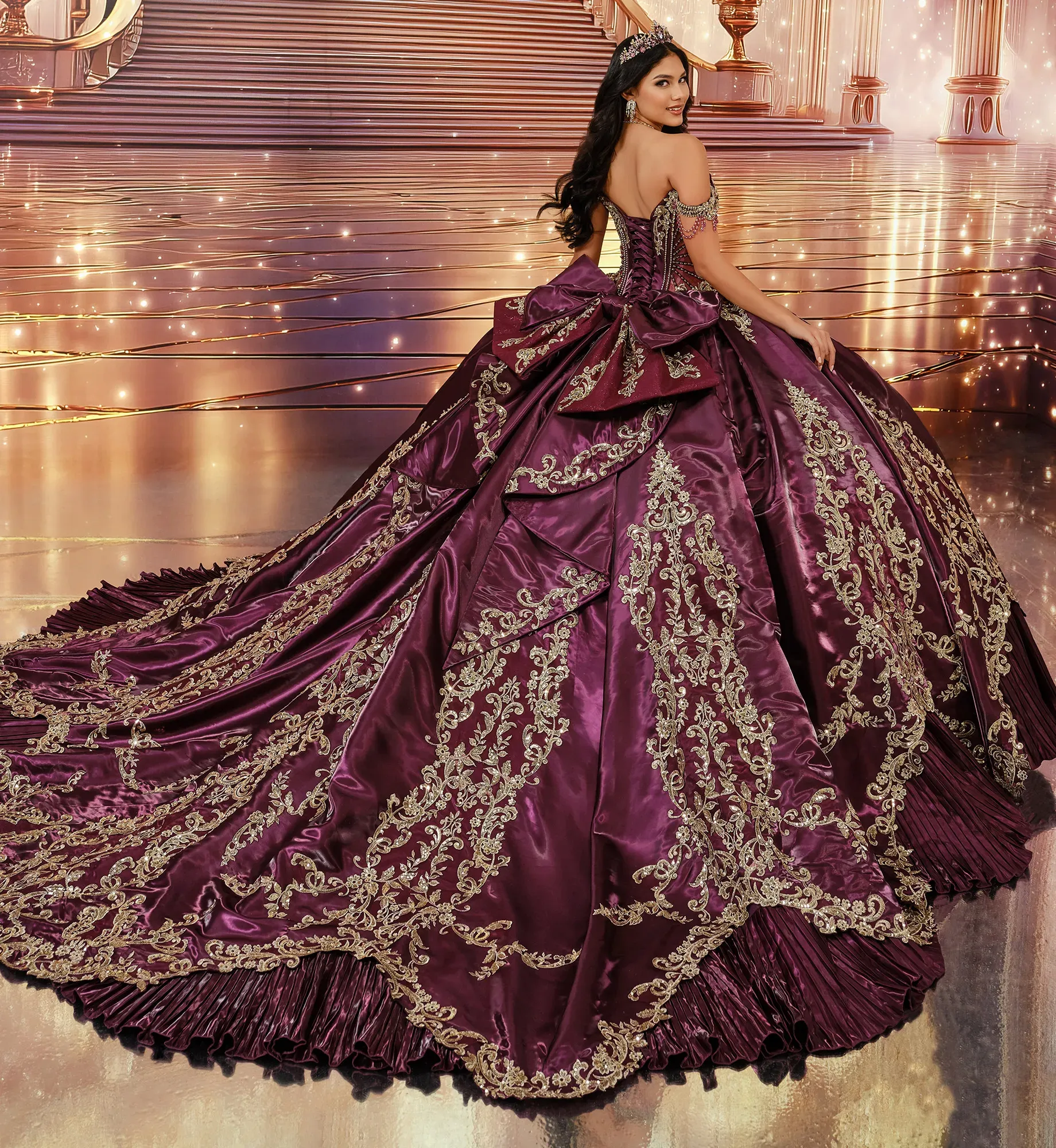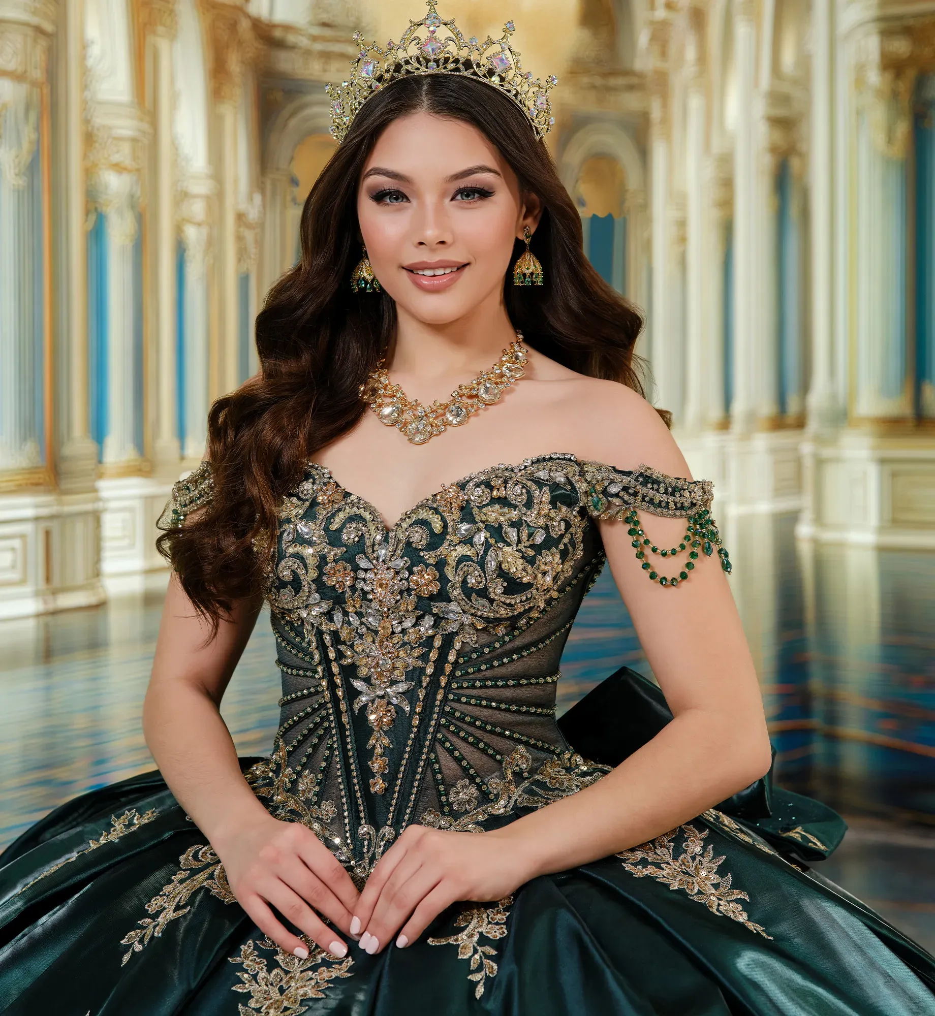 Sumérgete en la magia con este vestido de quinceañera con escote corazón, donde el elegante satén fluido y las joyas drapeadas adornan las mangas con hombros al descubierto, decoradas con apliques de encaje metalizado, abalorios, lentejuelas y detalles en pedrería. Incluye bolsillos, un lazo trasero desmontable, tirantes desmontables que dejan los hombros al aire y un panel de modestia en la espalda.