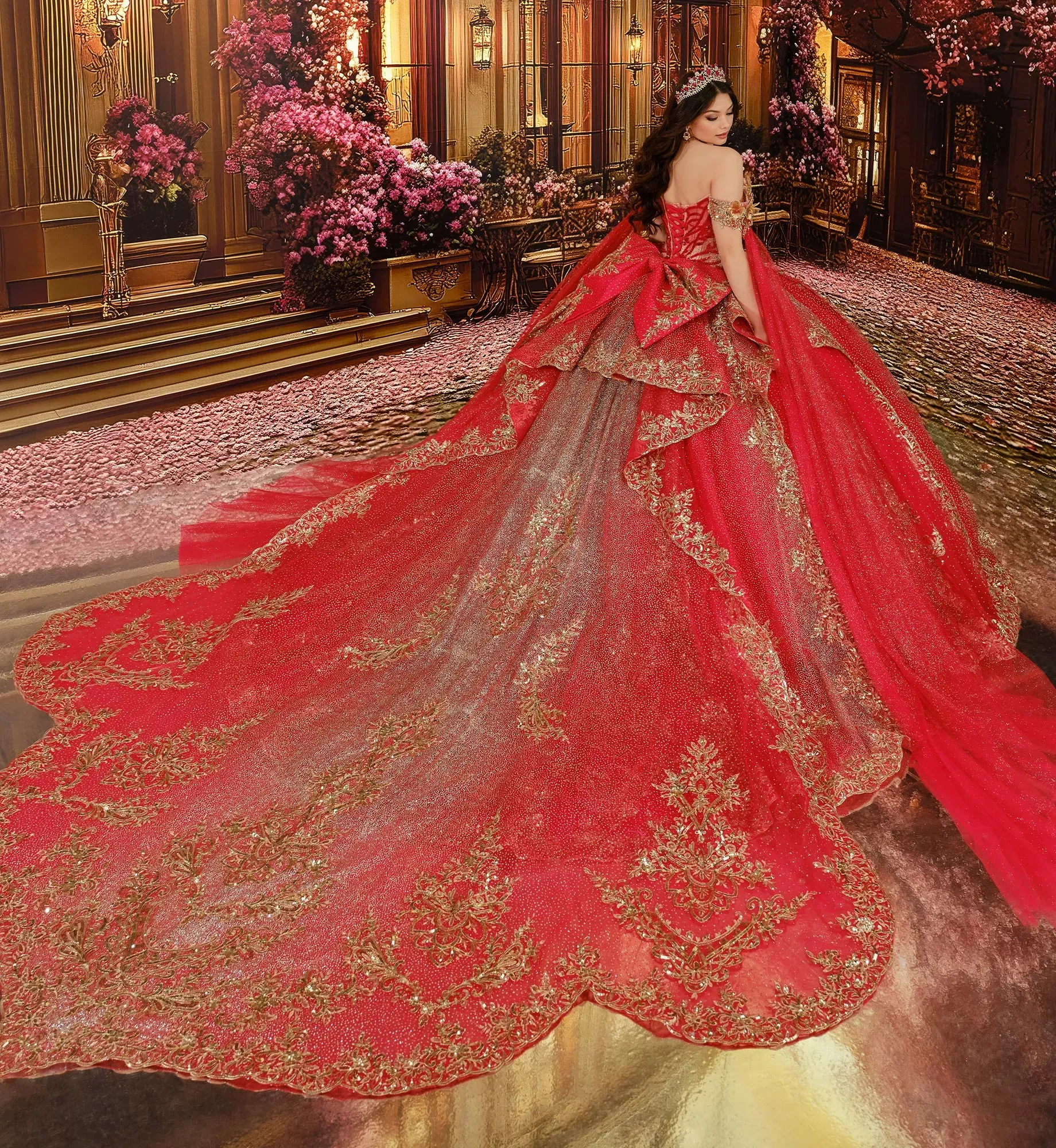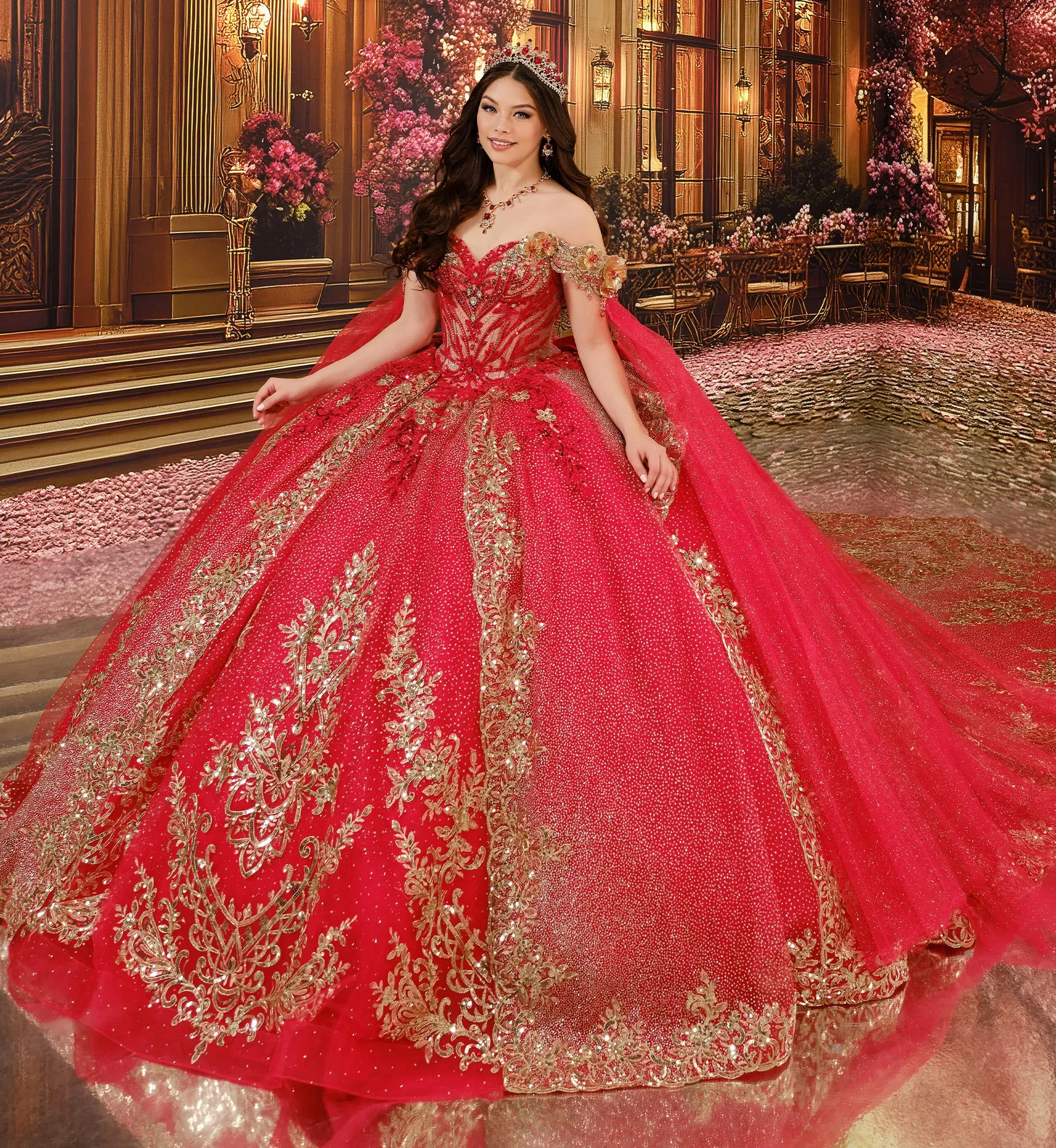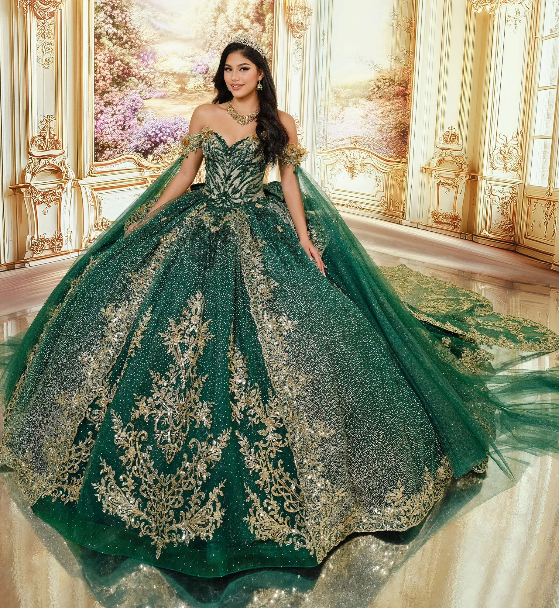 Brilla toda la noche con este precioso vestido de fiesta. El tul con lunares brillantes cae en cascada sobre la falda, mientras que las flores tridimensionales florecen delicadamente en los tirantes que dejan los hombros al descubierto, decoradas con apliques de encaje metalizado, abalorios, lentejuelas y detalles en pedrería. Incluye una cola desmontable, tirantes que dejan los hombros al descubierto, drapeado en las mangas, un lazo, una capa pequeña y un panel de modestia para la espalda.