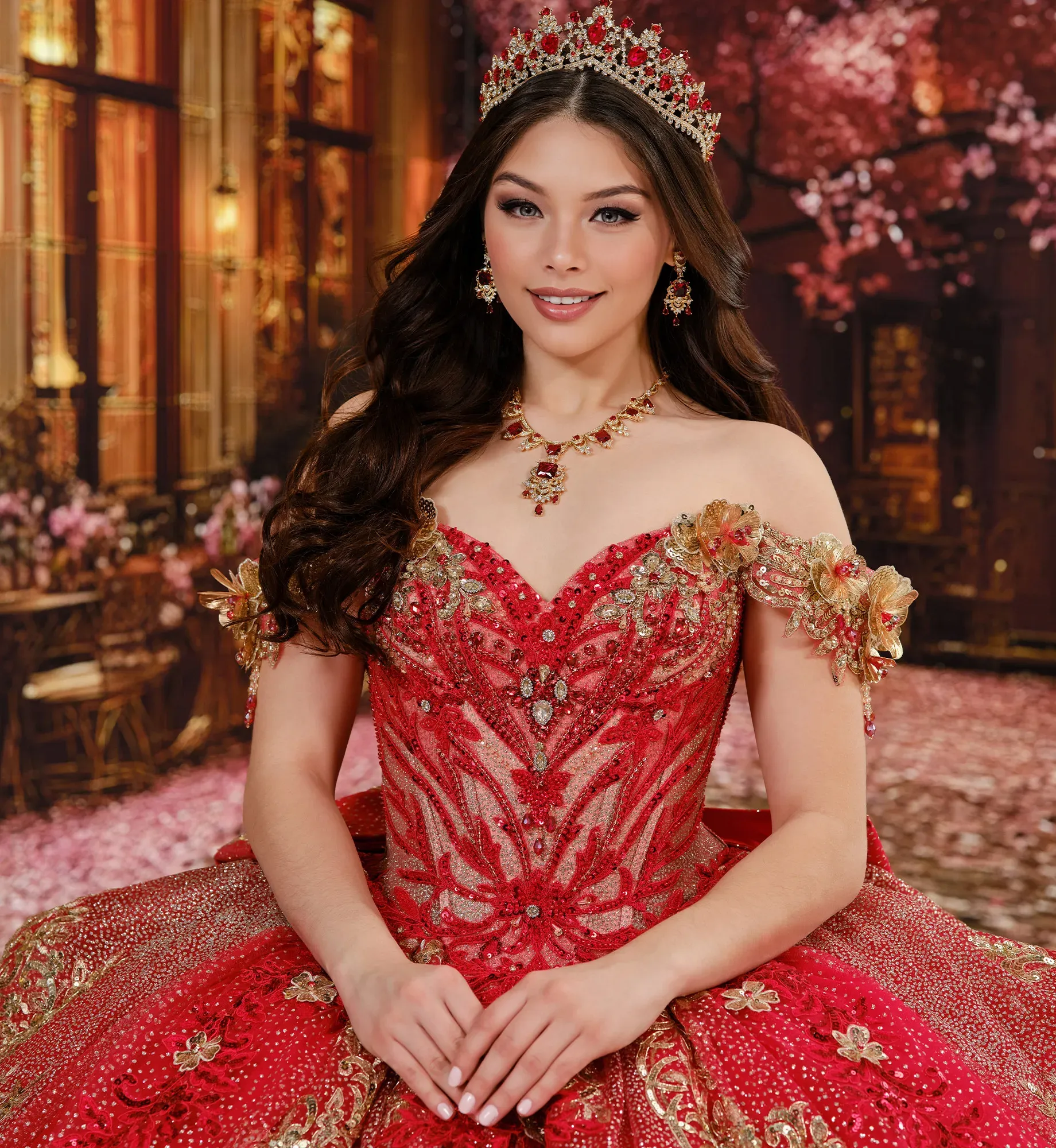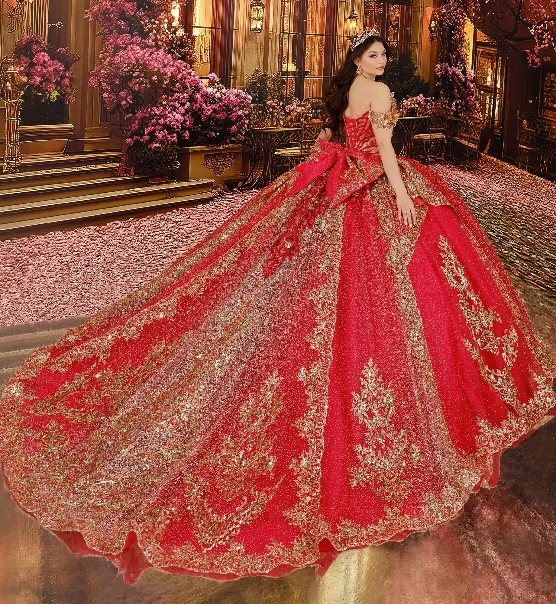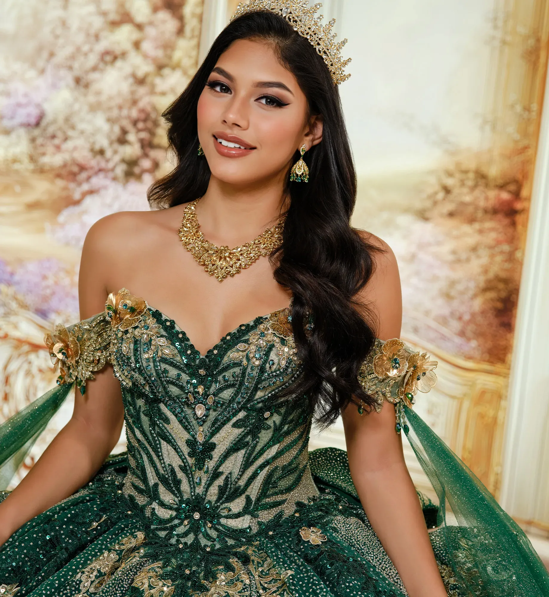 Brilla toda la noche con este precioso vestido de fiesta. El tul con lunares brillantes cae en cascada sobre la falda, mientras que las flores tridimensionales florecen delicadamente en los tirantes que dejan los hombros al descubierto, decoradas con apliques de encaje metalizado, abalorios, lentejuelas y detalles en pedrería. Incluye una cola desmontable, tirantes que dejan los hombros al descubierto, drapeado en las mangas, un lazo, una capa pequeña y un panel de modestia para la espalda.