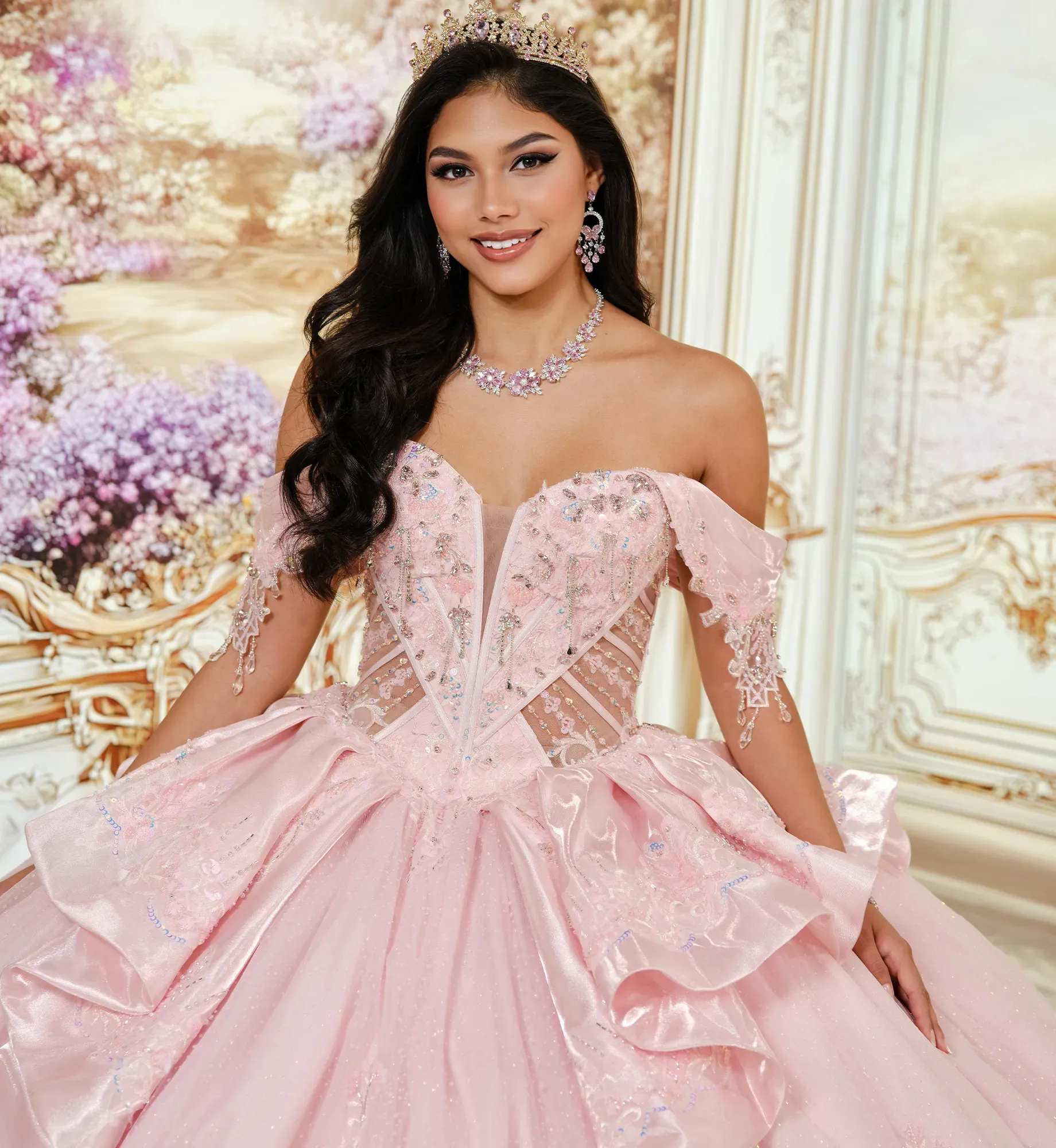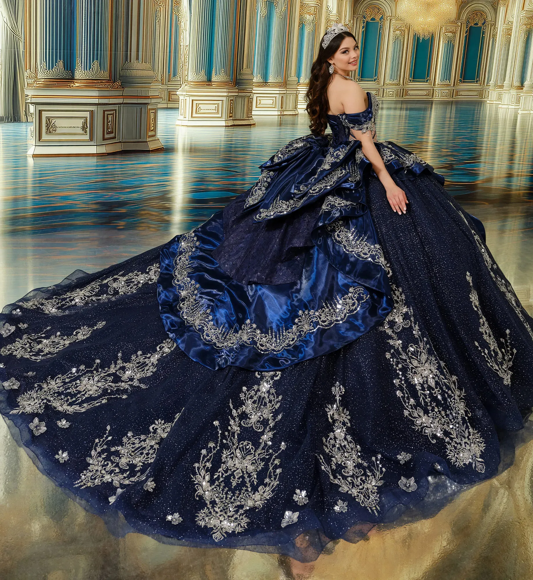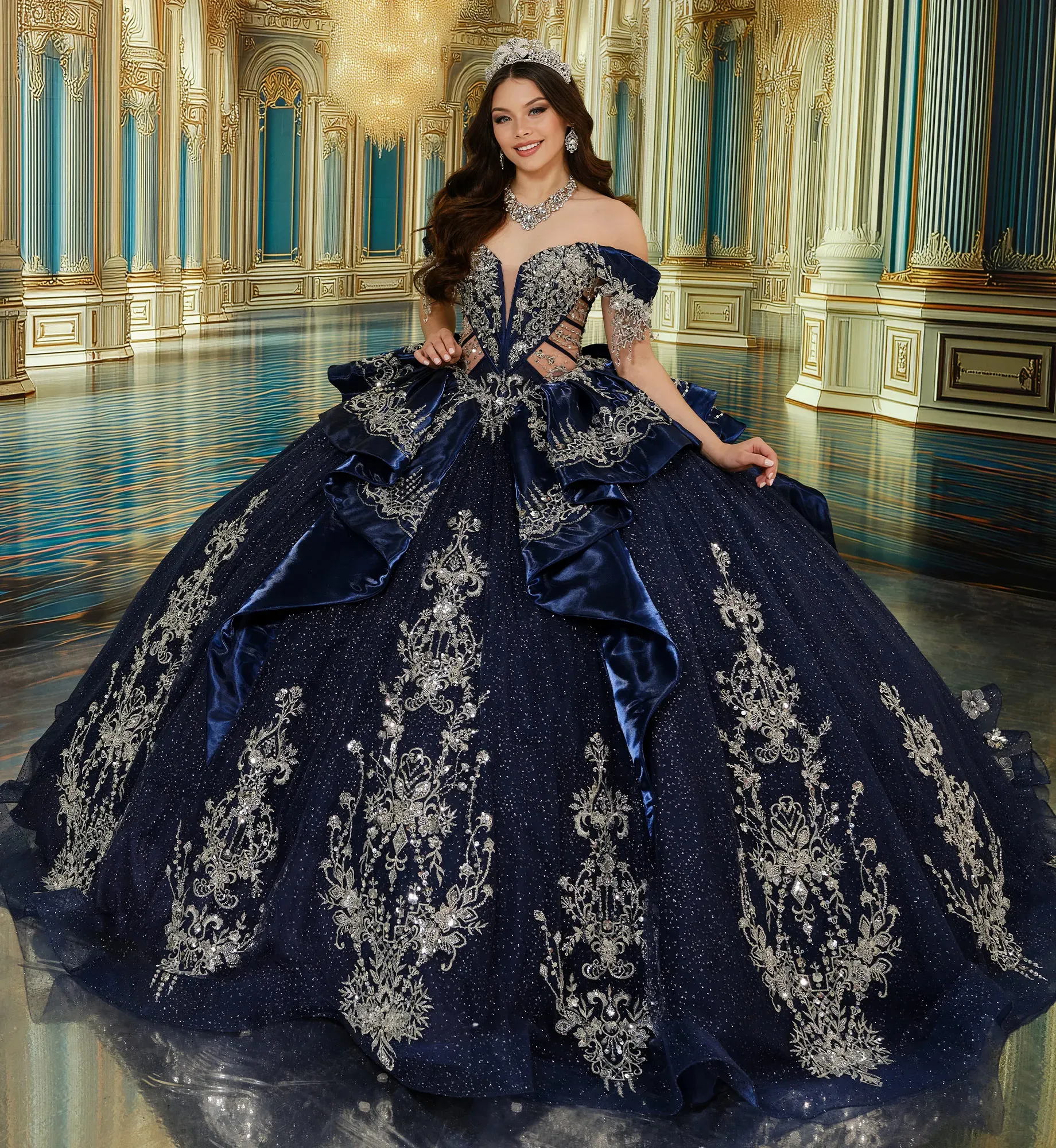 Este vestido de gala está diseñad con tul de lunares de purpurina que brillará al ritmo de las luces toda la noche. Su escote corazón de ilusión y aberturas semitransparentes en el corpiño le dan al vestido un toque de misterio. Está decorado con apliques de encaje, abalorios, lentejuelas y detalles en pedrería. Incluye bolsillos, tirantes desmontables que dejan los hombros al descubierto, un lazo, una capa pequeña y un panel de modestia para la espalda.