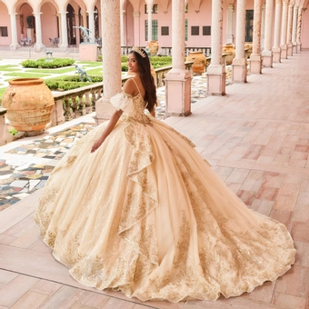 Haz una gran entrada con este espectacular vestido de Quinceañera. Confeccionado en encaje y tul brillante con purpurina, este impresionante vestido de gala es simplemente de ensueño. La falda ultra voluminosa cuenta con capas drapeadas únicas acentuadas con lentejuelas brillantes para crear un estilo de Quinceañera verdaderamente majestuoso. Las mangas cortas abullonadas separadas agregan un toque de fantasía y encanto, mientras que un impresionante mono grande y completamente desmontable y una cola de catedral desmontable completan este vestido de gala único en su tipo.